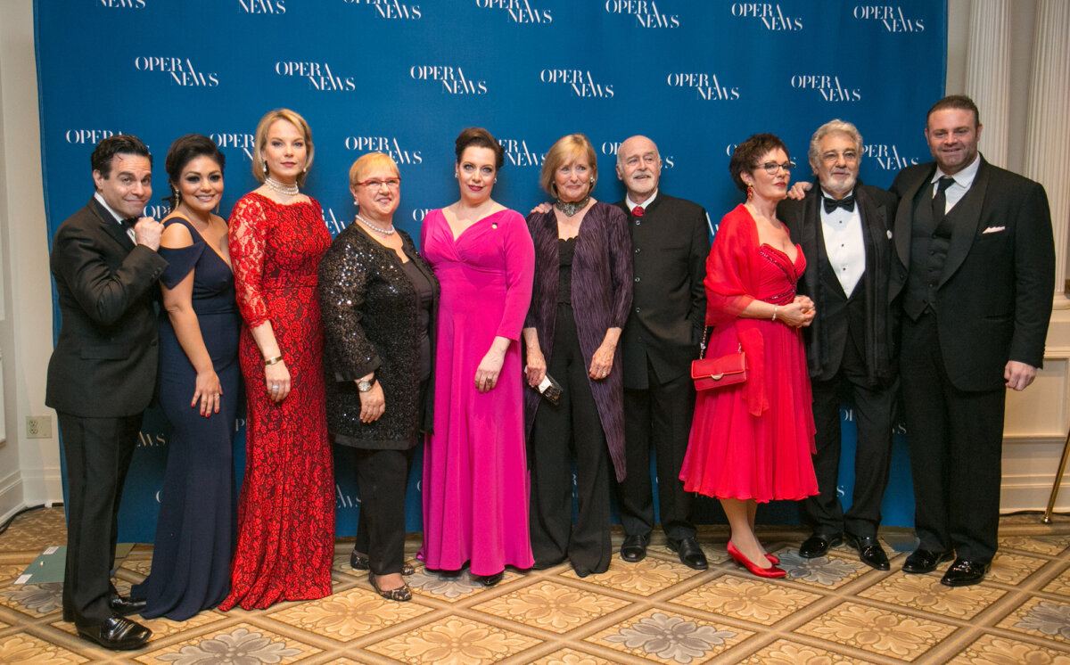 (L-R) Mario Cantone, Ailyn Perez, Elina Garanca, Lidia Bastianich, Nina Stemme, Frederica von Stade, Jose van Dam, Waltraud Meier, Placido Domingo and Joseph Calleja attend the 11th Annual Opera News Awards at The Plaza Hotel in New York on April 10, 2016. (Milene Fernandez/Epoch Times)